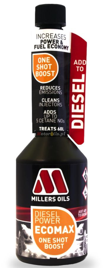 Dawka 250ml przeznaczona jest do stosowania w celu szybkiego przywrócenia właściwości układu paliwowo – wtryskowego oraz szybkiego podniesienia osiągów. Diesel Power ECOMAX to znakomity, najnowszy technologicznie dodatek do oleju napędowego współpracujący także z sinikami Euro IV i V, poprawiający osiągi samochodu zwiększona ilość detergentów szybciej czyści silnik i wydłuża żywotność wtryskiwaczy zwiększa liczbę cetanową oleju napędowego o 5 zapewnia szybszą reakcję na pedał przyspieszenia oraz większą moc przy niższych obrotach, co przekłada się także na mniejsze zużycie paliwa dzięki właściwościom smarującym, chroni podzespoły układu paliwowego użytkownicy potwierdzają bardziej płynną i cichą pracę silnika, oraz mniejsze zużycie paliwa lepsze spalanie i utrzymywanie silnika w czystości znacznie redukuje ilość szkodliwych związków wydzielanych wraz ze spalinami chroni układ paliwowy przed korozją chroni paliwo przed starzeniem.